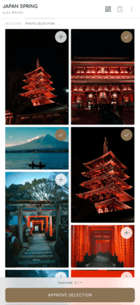Clients browse the gallery, tap favourites with the plus icon, and confirm their pick. You get a notification with the selected list — ready for editing and delivery. Simple and clear, without extra paperwork.