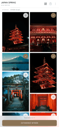 Klient przegląda galerię, zaznacza wybrane zdjęcia ikoną plus i zatwierdza wybór. Ty otrzymujesz powiadomienie z listą wybranych zdjęć - gotową do obróbki i dostarczenia. Prosty, przejrzysty proces bez zbędnych formalności.
